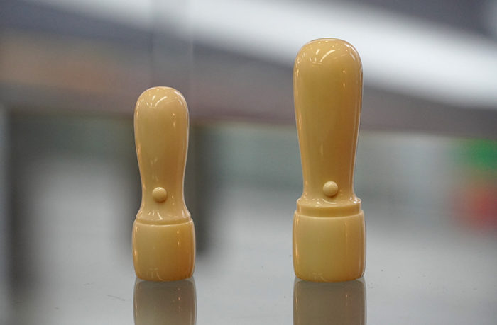 左が法人印の通常サイズ60㎜丈×18㎜丸です。
