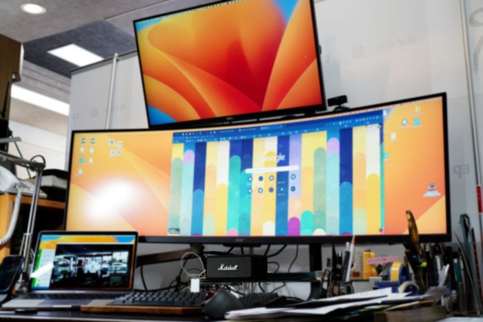クラムシェルモードでも画面が足りなくて、結局3つのモニターを駆使していますが、その中央にMarshall。