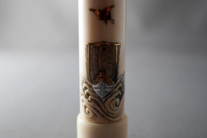 宝船の象嵌のベースには波の彫刻が施され、どの角度から見ても存在感を放っています。