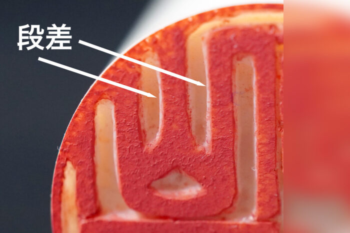 上の写真は実際の印面になるのですが、表面に朱墨を打っており、印面の朱色に対して白い土手が見えて「段差」ができています。